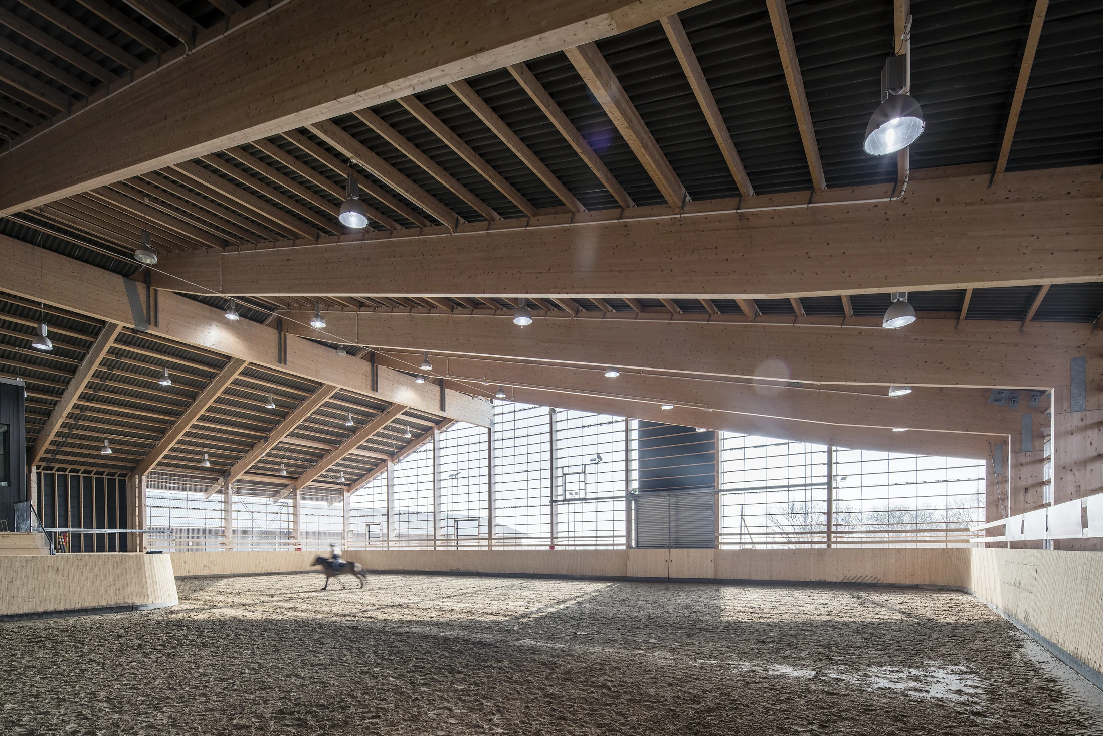 Takket være mulighetene til store, frie spennvidder er Martinsons bærekonstruksjoner i limtre det beste valget for både ridehus og staller. Den naturlige trefølelsen hos materialet skaper behagelige innemiljøer og fantastiske rammer for virksomheten. Med sin ekstremt lave klimapåvirkning er bærekonstruksjonene dessuten mer miljøvennlige enn alle konkurrerende byggematerialer.