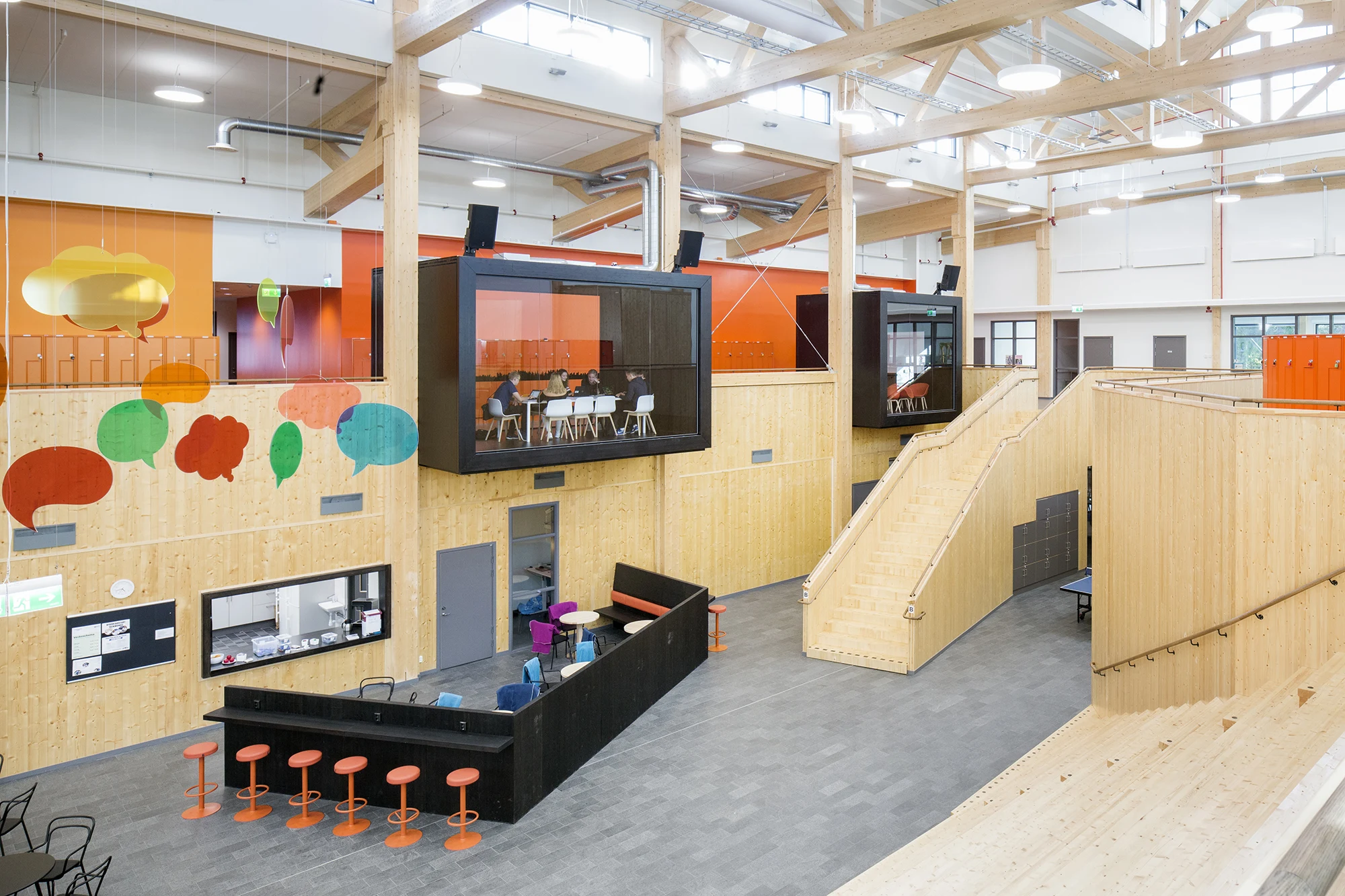 Stort, högt och luftigt Stomsystemen i limträ och KL-trä ger stor flexibilitet för att möta de behov och krav som ställs på byggnaden.